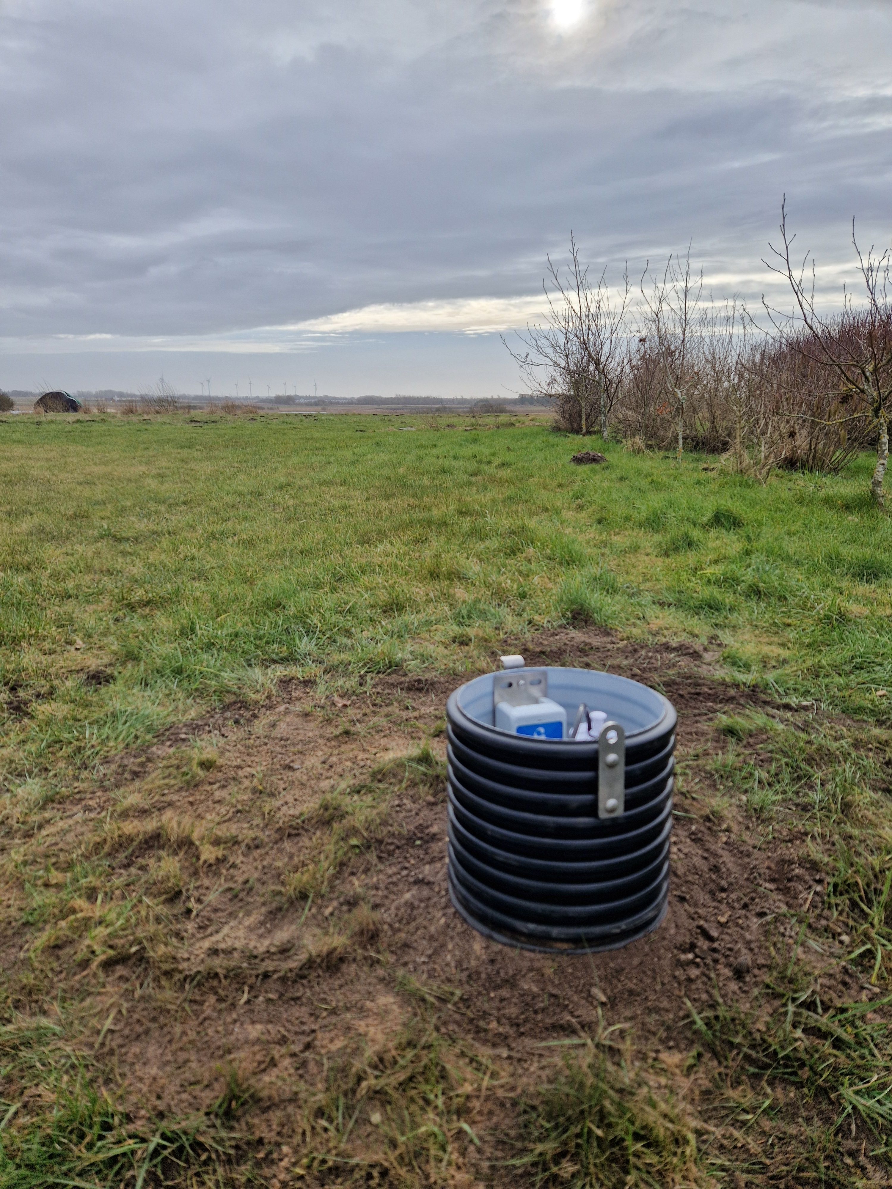 I denne case er der etableret fire boringer ned til tre meter under terræn, hvori der er installeret online vandstandsmålere. Området er udlagt til bebyggelse med planer om lokal håndtering af regnvand. Overvågningen skal dokumentere den dynamiske grundvandsstand og dermed vurdere, om en LAR-løsning er hensigtsmæssig.
